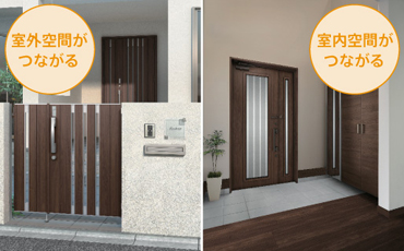 また、門扉から玄関ドア、フローリングと、同色素材でデザインを統一することができ、エントランスをオシャレに演出することもできます。![]()
